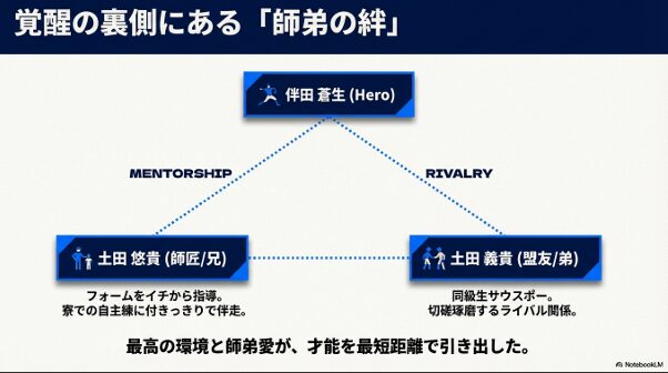 伴田蒼生投手が山口達也監督から絶対的な信頼を寄せられ、チームの精神的支柱であることを示す図解