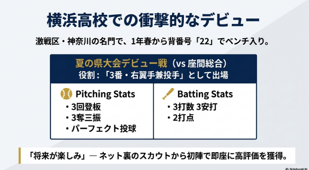 横浜高校に入学して早々、小野選手はその才能を爆発させます。1年生の春から早くも背番号22でベンチ入りを果たすと、夏の県大会では「3番・右翼手兼投手」という重責を担いました。デビュー戦となった座間総合戦では、3回を投げて3奪三振、パーフェクト投球を披露し、打っても3打数3安打2打点と完璧な仕事をこなしています。この試合でネット裏のスカウトからは「将来が楽しみ」と高い評価を受けました。